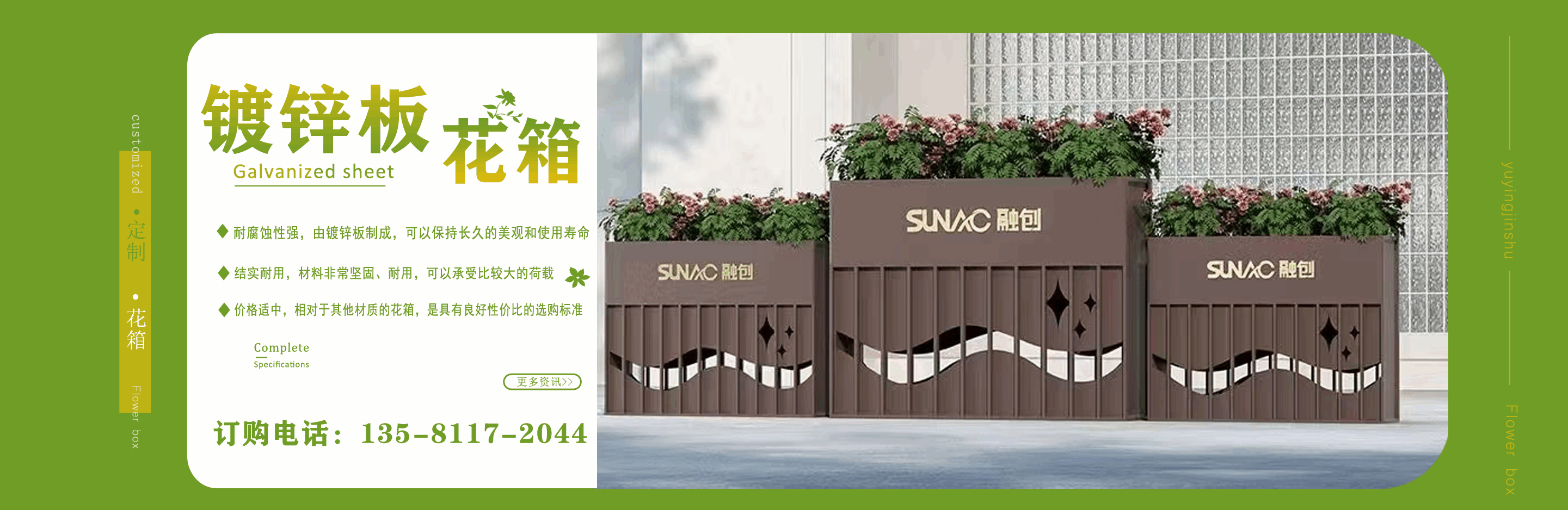 山東鈺盈金屬制品有限公司主營鍍鋅板花箱,道路隔斷花箱,定制花箱,戶外道路花箱,花箱座椅等產品,產品結構合理、性能優良,具有強度高、耐腐蝕、抗老化、隔熱隔音、節約能源、外形美觀、使用壽命長等優點,深受國內外客戶認可?! ∥覀兏鶕蛻羲诔鞘械奈幕卣?,制造出符合當地城市文化氣息的自然立體、觀賞性強的花箱產品成為城市里一道靚麗的風景線。 公司實行誠實、公正、守信、價格合理、平等互利。 公司憑借雄厚經驗實力,恪守誠信為本的原則,得到了眾多客戶的信賴,并在業界獲得良好的口碑。建立了穩固的合作關系,隨著業務的不斷發展和壯大,合作伙伴的范圍也在不斷擴大。我們熱情盼望與您的合作,為社會的可持續發展獻上一份努力。...
